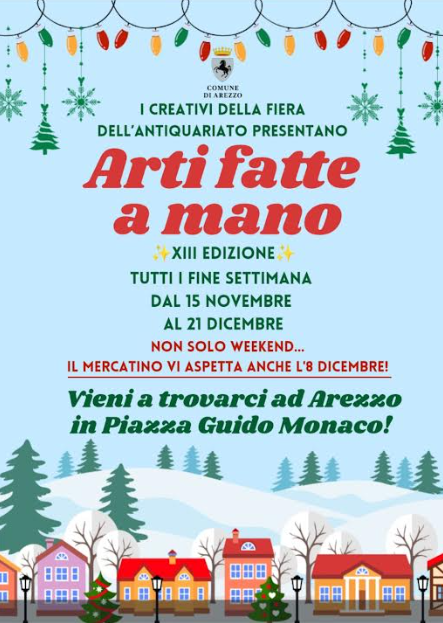 Piazza Guido Monaco si anima con la 13° edizione di “Arti fatte a mano ” tutti i sabati e le domeniche dal 15 novembre al 21 dicembre e l’8 dicembre potrete immergervi nel mercatino natalizio di prodotti artigianali realizzati da espositori della fiera antiquaria e da altri provenienti dal territorio.